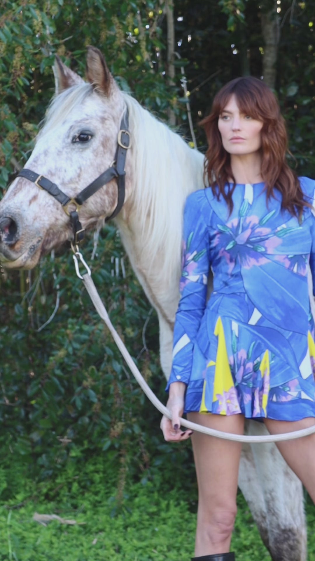Introducing a seasonal feature piece, the Phoenix Mini Dress. Created in a lustrous, GOTS-Certified Organic silk, bias-cut with a hand-placed & hand-illustrated abstraction of lake-side florals, it exemplifies effortless style and ease. An invisible zip, and construction in a silk, ensures it flatters, as the drapes down the back and to the waist in a striking mini skirt with contrast godets bias-cut silhouette, in Muma's unmistakably radical colours.