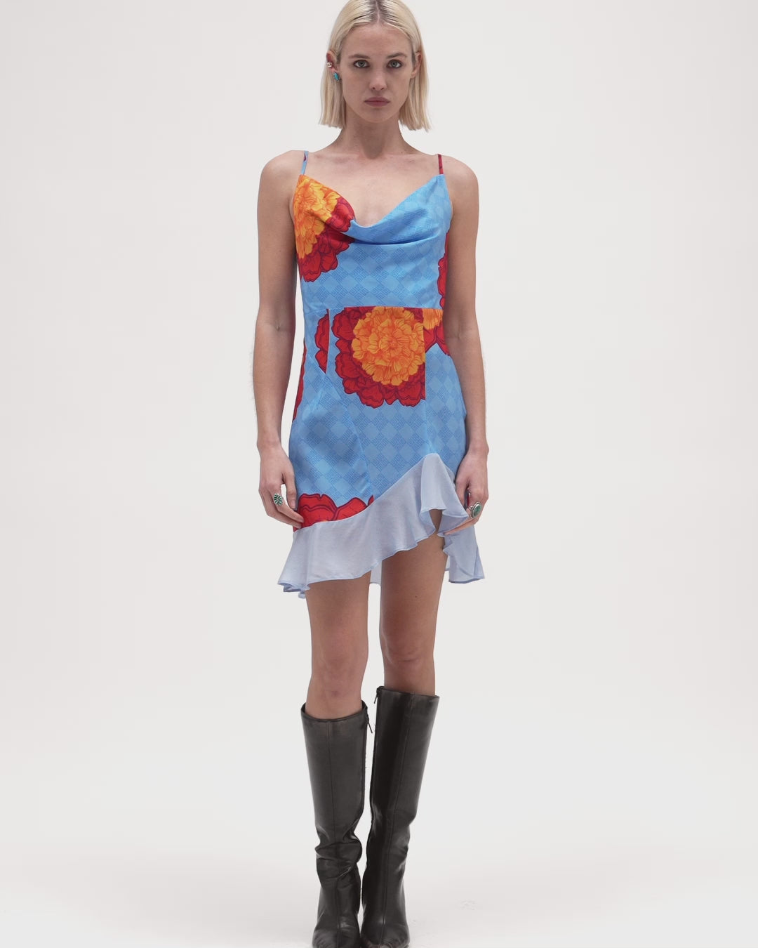 Introducing the Frill Mini in a layered Californian Poppy print. Hand-set in 100% GOTS Organic Silk CDC the cowl neck and anchoring frill creates an elegant & attractive silhouette layered along elegantly placed panel lines, flattering bust to waist as the perfect seasonal wear. With adjustable straps and custom Muma hardware, it drapes along the fluidity of your form with ease as a perfect wardrobe staple in summer, and layered in cooler months.