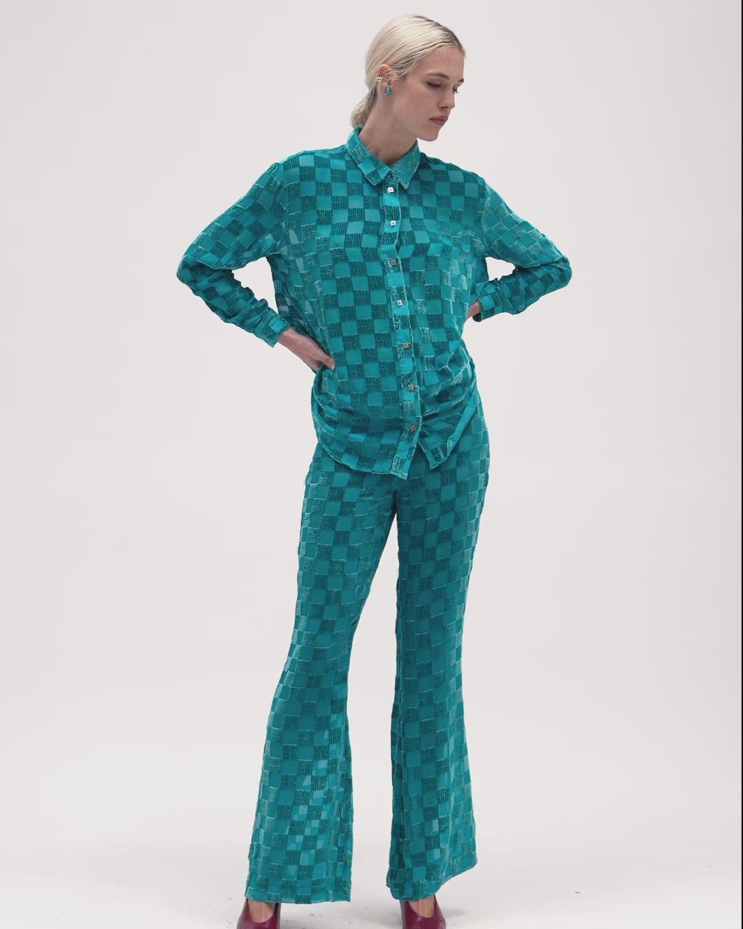 Welcoming the velvet check. These elegantly draping 100% Organic GOTS-Certified silk pants boast a flared and fluid fit to accompany you wherever you go. With a flat waistline, and crafted with pockets in a cut that swoops elegantly into a soft flare, they'll be taking you to your destination in class and comfort. Designed in an all-flattering chamfered cut, wear with accompanying shirt. Size up to ensure space to move.