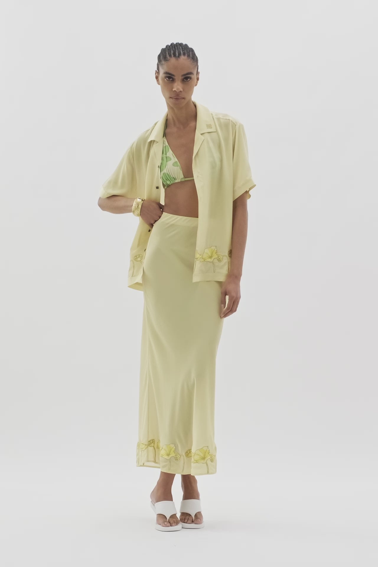 Created in a lustrous, silky blend with a Muma hand-illustrated and hand-placed Lotus Flowers & Leaves from the region in-focus, the Lotus Embroidered Short Sleeve Shirt is detailed with a pointed spread-collar neckline, embroidered illustrative detailing around the hem, and custom Muma buttons. With a straight and fluid fit to accompany you wherever you go, wear as a set or contrast with one of the other bold patterns in the range.