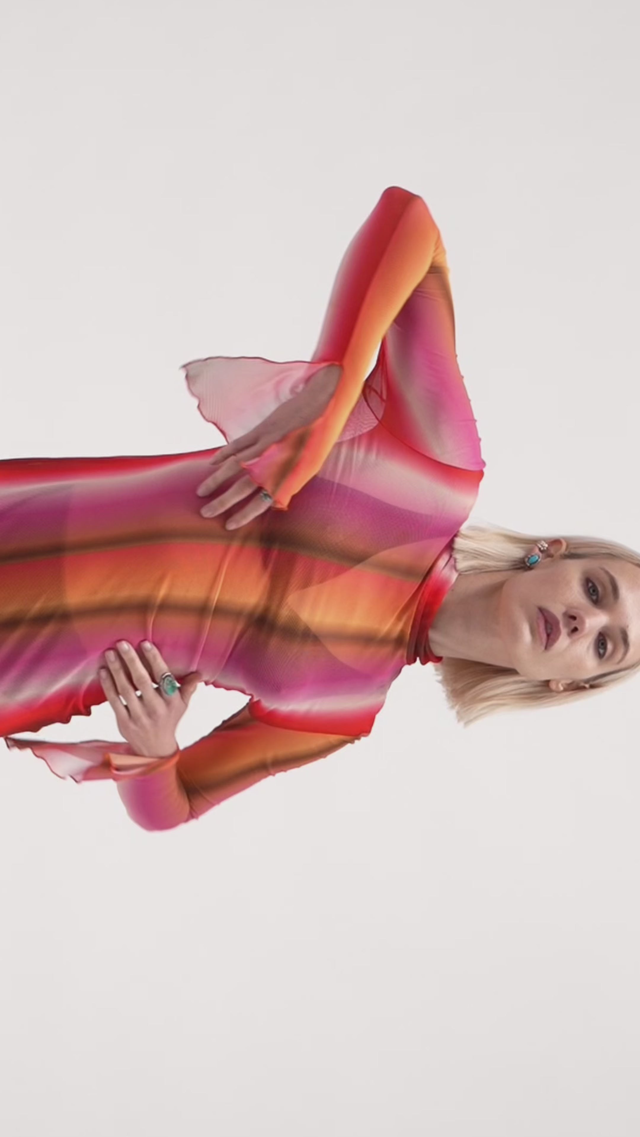 Hand-set, and crafted in a semi-sheer mesh, a sleek and flattering silhouette with an abstraction of the Mirage Desert Gradient. From a stylish high neck into flared split cuffs with silver logo detail, the Mirage Mesh Mini is a season highlight.