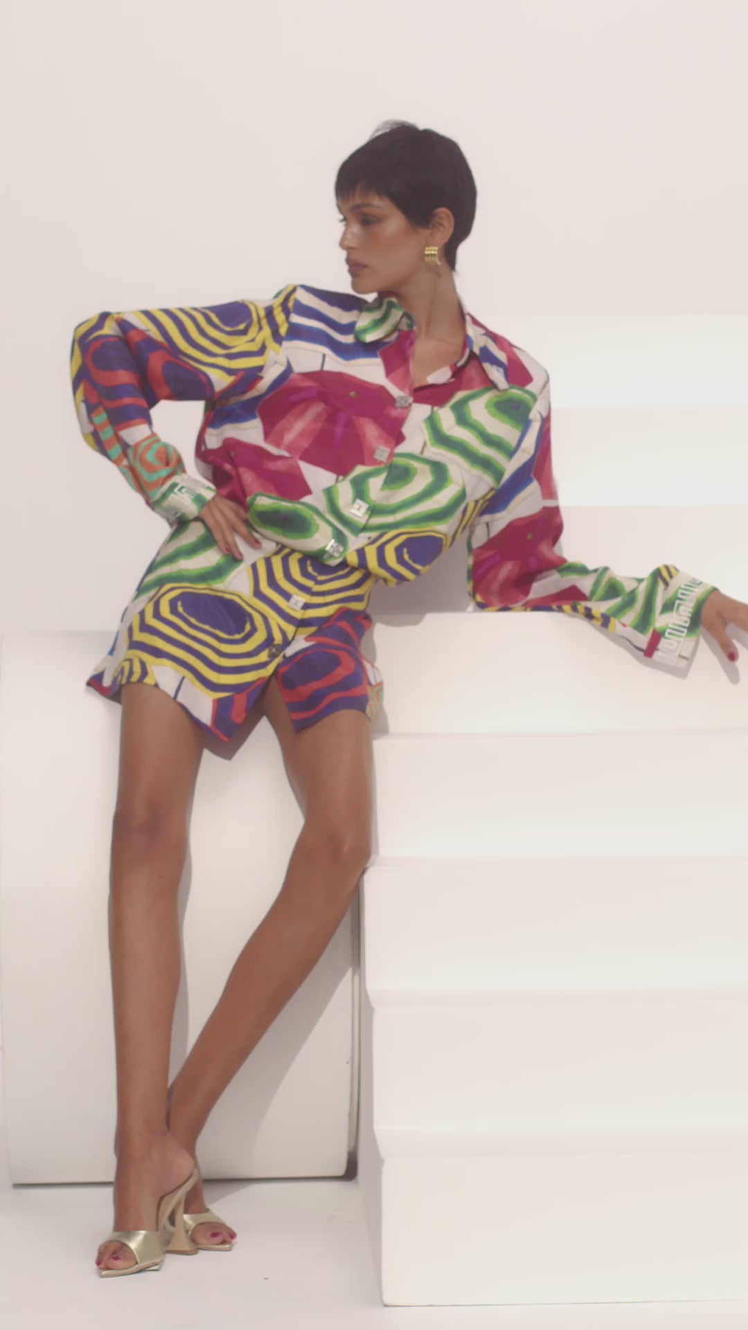 Our exclusive, hand-drawn, hand-set seasonal feature piece, the Riviera Shirt Dress is crafted in a vegan cupro blend that invokes the smoothness of silk. With each feature convening beautifully to create a tailor-inspired piece, with elegant square cuffs and signature Muma buttons, we establish a defining and luxurious finish, while removable shoulder pads above a classic shirt collar express a feminine power look not to be contended with. Sporting a long-sleeved, mini silhouette, this time-honoured fit is a straight cut with button fastenings down the midline and a subtle flare at the skirt. Invisible elastic comes in at the small of the back to invite the wearer to don the garment as they choose, and makes sizing a less fastidious affair. Wear it as a dress, or buttoned down as a smoking-jacket-esque overcoat.