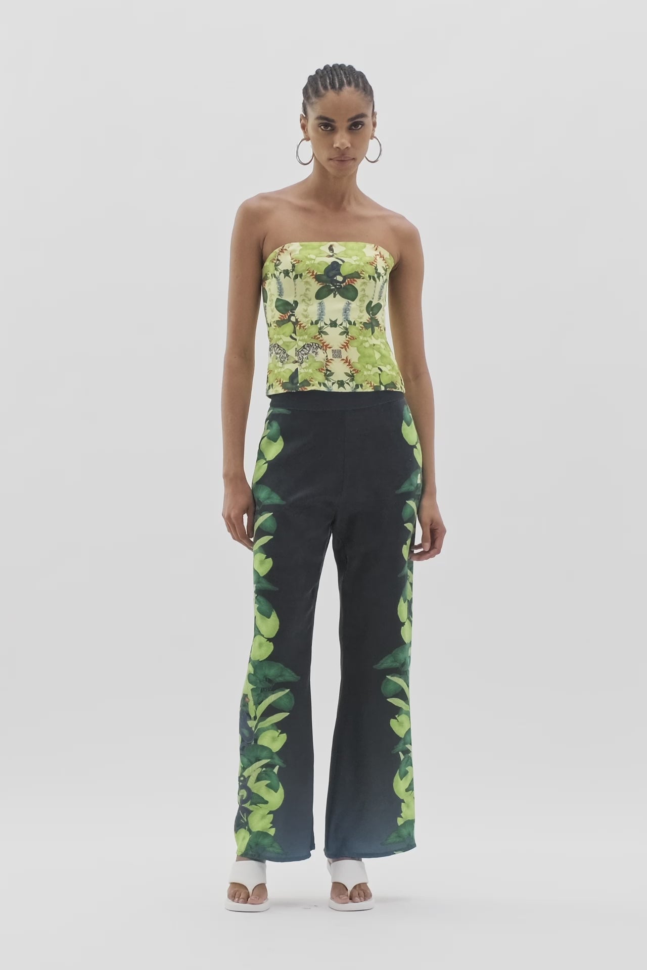 A lurking in the shadows. Dense jungle. Night & day blur in a hand-placed gradient feature piece. These elegantly draping vegan cupro pants boast a flared and fluid fit to accompany you wherever you go. With a flat waistline, and crafted with pockets in a cut that swoops elegantly into a soft flare, the Yin Mixed Palm Pant asks to be worn your way – around your hips or higher on your waist, taking you to your destination in class and comfort. Designed in an all-flattering chamfered cut, wear with accompanying Top or Crop, or contrast with one of the other bold colours in the range.