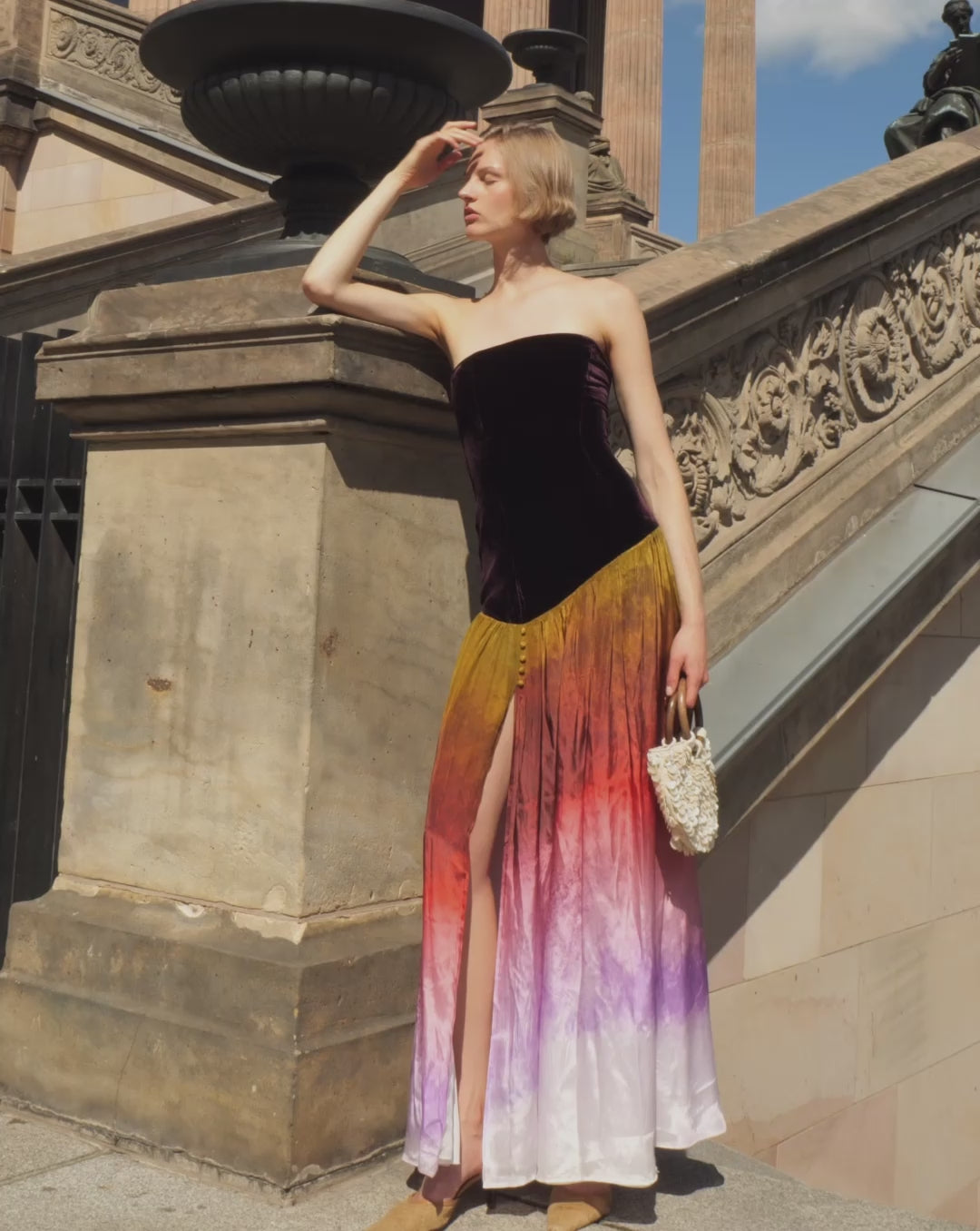 Welcoming a seasonal statement, the Dried Lake Veriga Dress. Set on a lustrous velvet body, the asymmetric arrangement gives a contemporary edge. With a square bandeau neckline & weight in the skirt exuding elegance and minimalism, in a contrast twist of our seasonal dried lake print. The fit-and-flare silhouette is figure defining and gracefully flares into a bubbled shape for dramatic fun. Limited edition, with only few pieces for purchase.