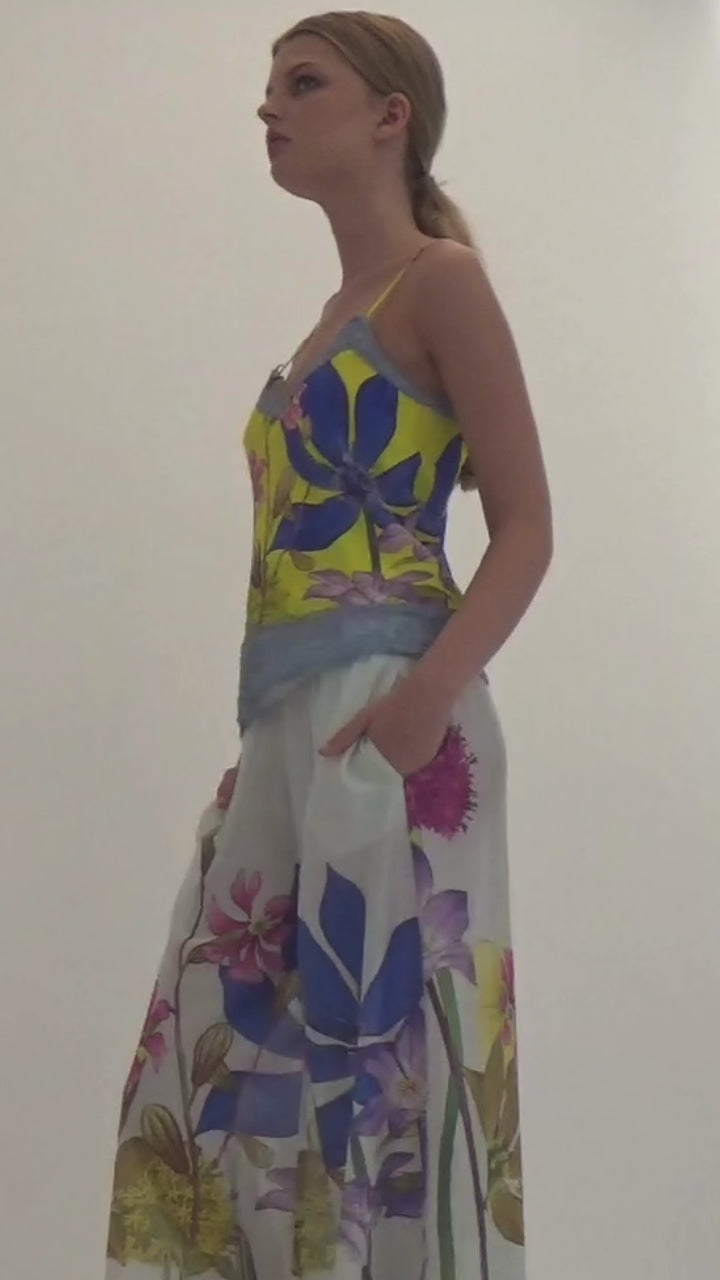 Introducing the In The Garden Laced Estelle Cami, featuring delicate lace detailing and contrast to a bold rendition of the signature Garden Print. Crafted from 100% GOTS-Organic Silk, with adjustable straps for a customisable fit, it enters the room as a versatile statement piece. Pair with the wide leg pants for a signature contrasting moment, or the tailored pants.