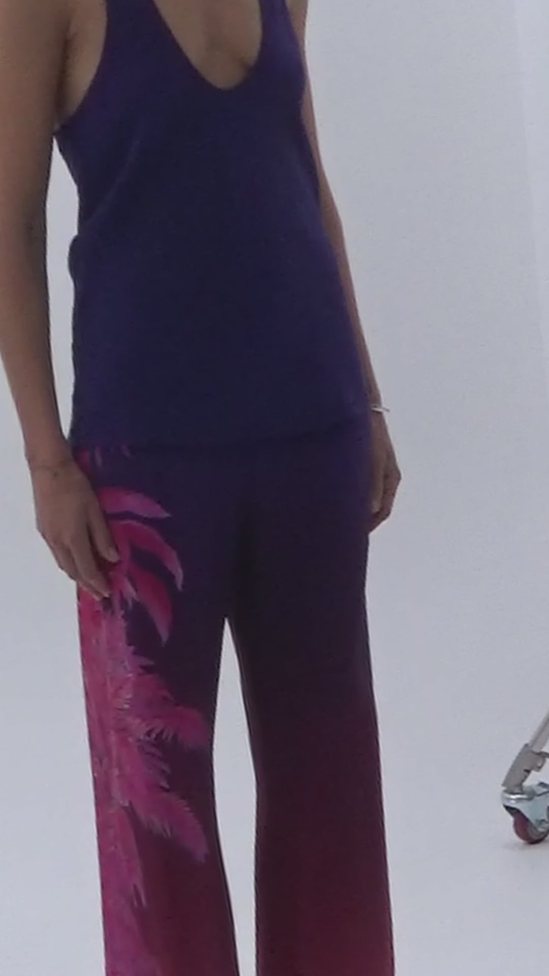 The Midnight Bias-cut pants feature the elegant Havana Dawn gradient, transitioning from deep magentas to a midnight navy. The pants have a loose, flowing silhouette that drapes beautifully to the ankles offering both comfort and sophistication. A weighted geometric embroidery detailing also matches the cuffs of the matching shirt, and together with vibrant pink cuban leaves a continuation of the story, they create a cohesive, eye-catching look. This co-ordinated set whether paired together or contrasted with other stories, is perfect for making a bold, stylish statement with a luxurious tropical cuban flair.