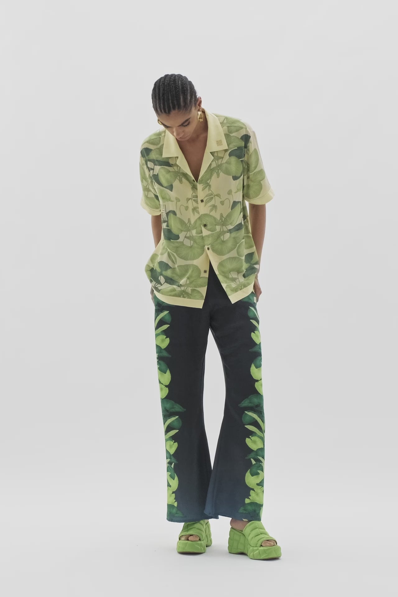 Created in a lustrous, 100% organic silk chiffon with a Muma hand-illustrated and hand-placed botanical pattern from the region in-focus, the Yin Palms Short Shirt is detailed with a pointed spread-collar neckline, embroidered logo, and custom Muma buttons. With a straight and fluid fit to accompany you wherever you go, wear as a set or contrast with one of the other bold patterns in the range.