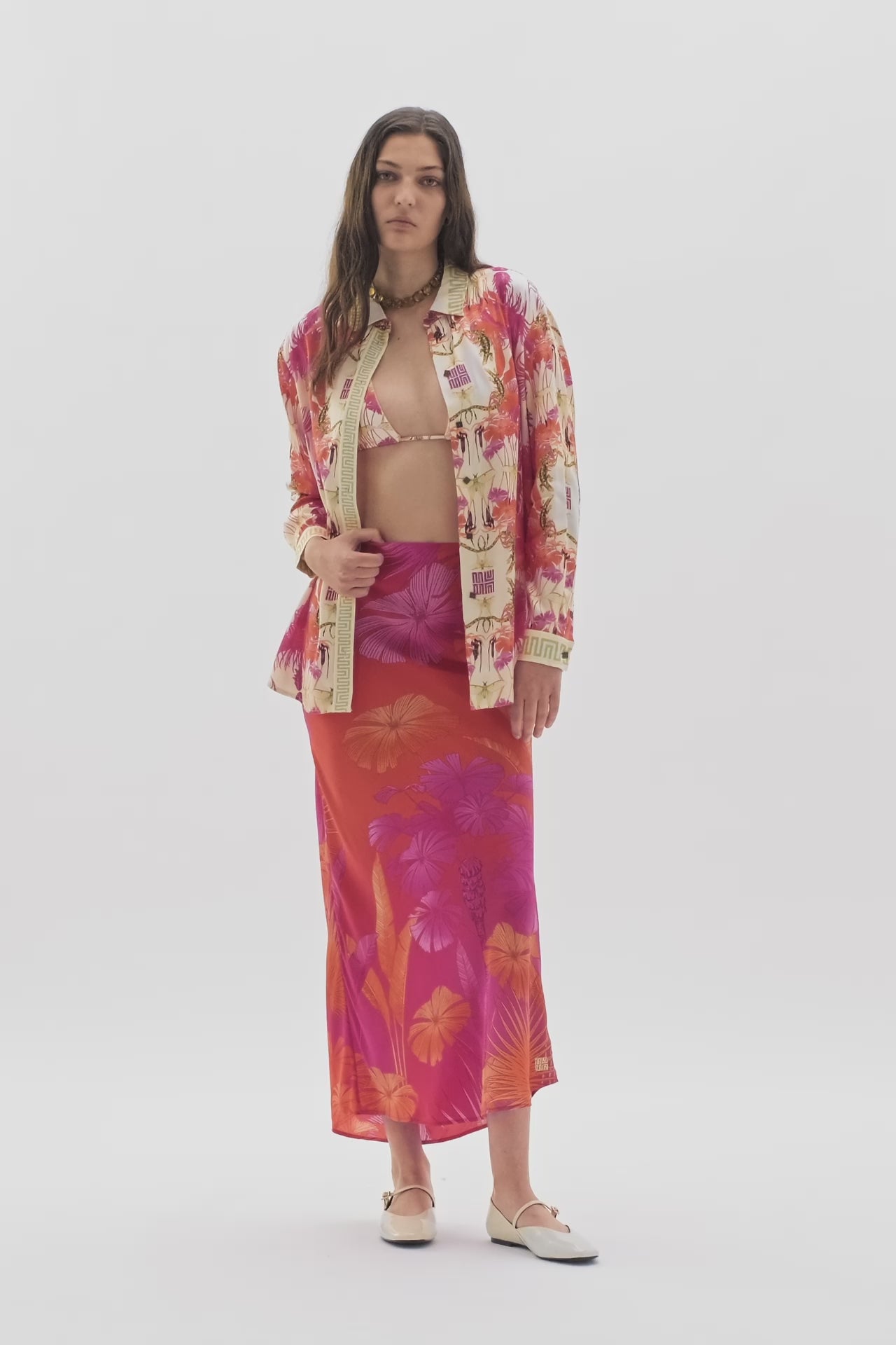 A world alive, a jungle awakened. Introducing Yin's golden morning hues in the The Yin Part 02 Illustrated Long Sleeve Shirt. This shirt boasts a straight and fluid fit to accompany you wherever you go. Our biodegradable vegan cupro is cut in a maximalist and uplifting style – a harmonious balance of distinguished elements. Wear with accompanying pants, crop, or dress, or contrast with one of the other bold colours in the range. Muma's colour & fabrications makes an unmistakably radical finish, while custom Muma buttons and a timeless spread-collar neckline invites the wearer to make it their own.
